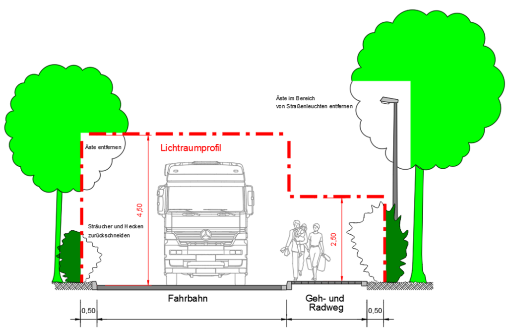Das sogenannte Lichtraumprofil beträgt über Straßen 4,50 m, über Gehwegen 2,20 m und über Radwegen 2,50 m. Neben Straßen und im Anschluss an Rad- und/ oder Gehwege beträgt das Lichtraumprofil 0,50 m (siehe Skizze).