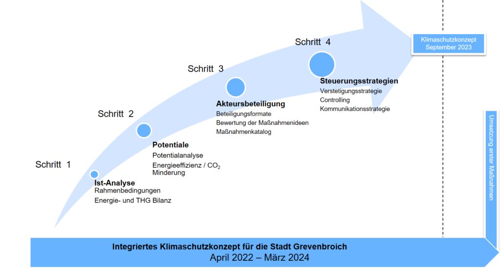 Das Projekt zur Erstellung eines integrierten Klimaschutzkonzepts für die Stadt Grevenbroich läuft von April 2022 bis März 2024.